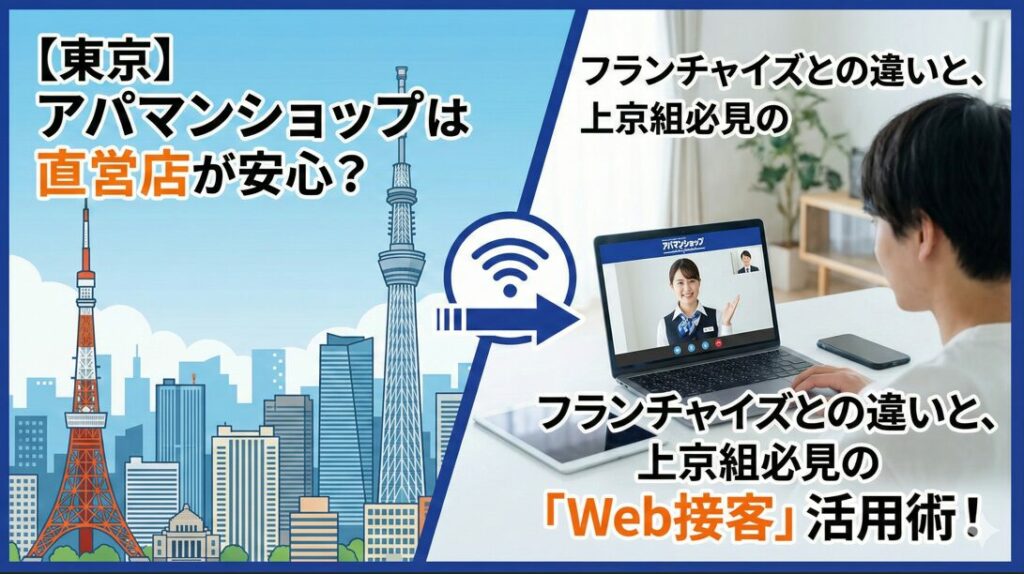 「東京の部屋探し、アパマンショップ直営店とフランチャイズ店どっちが安心?」そんな疑問を解決!複雑な東京の街こそ生きる「地域密着FC」の強みと、スピード勝負の上京組が絶対に使うべき「Web接客」の活用術をプロが解説します。来店不要で理想の部屋を見つけるコツとは? -