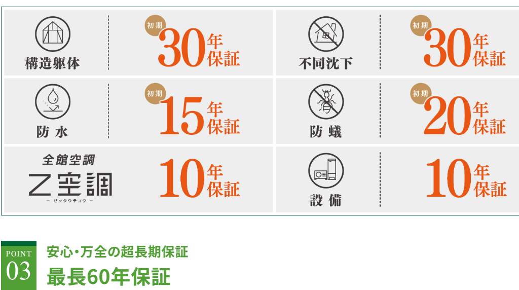初期保証20年・延長保証にも対応し、長寿命住宅を目指す家庭に安心を提供します。