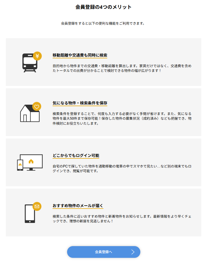回答者利用した際は、仕事関係で異動がありまして、地方からの引っ越しを考えるしかなく、ネット検索していたら、自由に探す、自分で選べるスタイルがグッと惹きつけられたのがきっかけに。