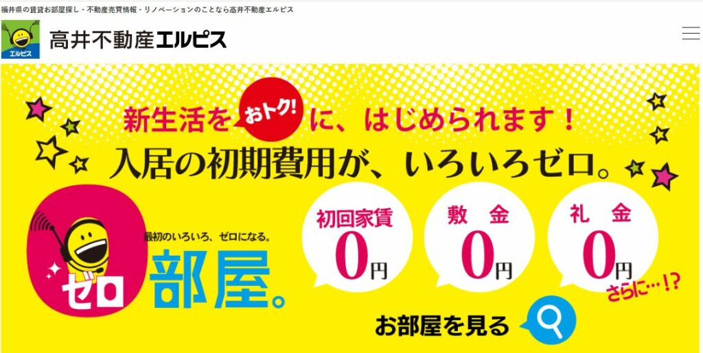 | 高井不動産エルピス | 福井で豊富な仲介件数を誇る会社 | 福井市中心・近郊 | - | 敷金礼金ゼロあり | 7年連続仲介件数日本一 | - |