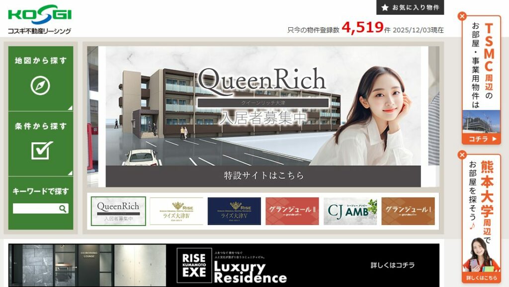 コスギ不動産熊本県内で規模が大きい地場不動産会社熊本市内、近郊エリア約4,500件敷金礼金ゼロあり様々な物件タイプを扱う幅広さ管理/仲介物件により異なる。要確認
