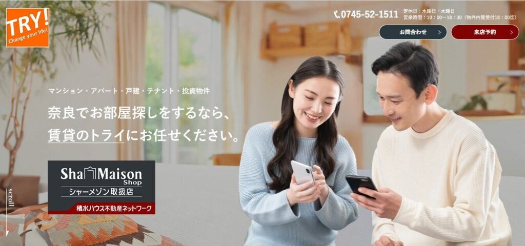 | ちんたいトライ 奈良店 | 奈良地域密着 | 奈良県全域 | 約580件 | 敷金礼金ゼロあり | 柔軟な対応 | -(仲介手数料ゼロあり) |