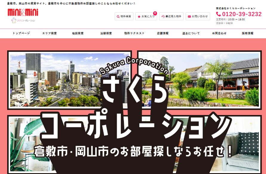| さくらコーポレーション | 岡山地域密着型 | 倉敷市・岡山市中心 | 約5,600件 | 敷金礼金ゼロ多数 | 地域情報豊富 | 家賃1か月分(物件による) |