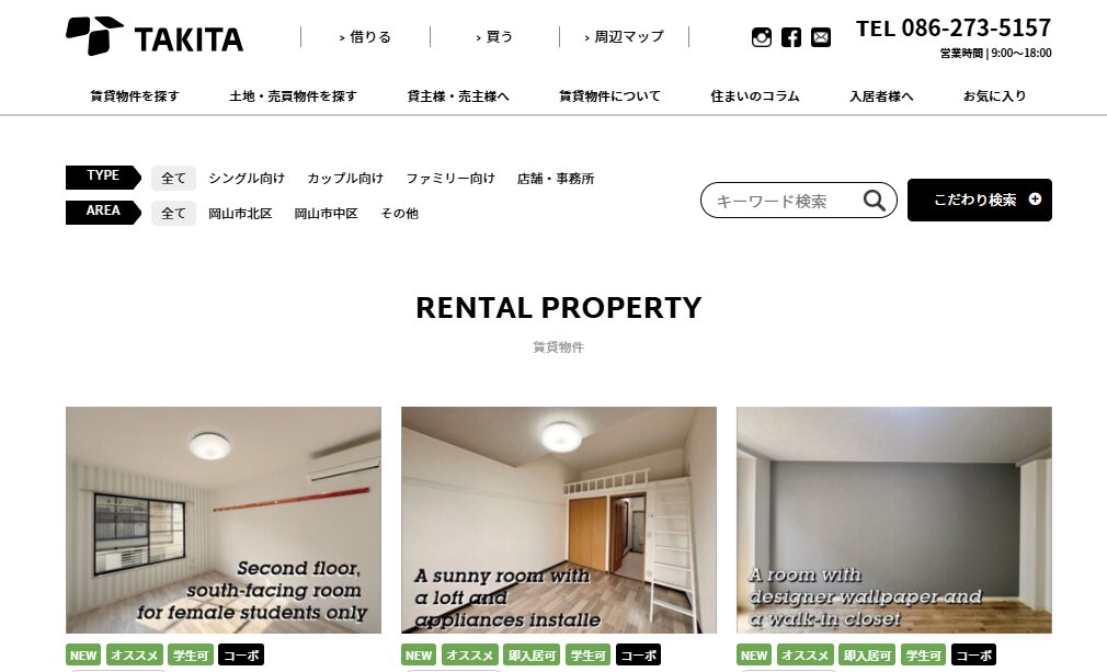 | 取扱い物件タイプ | マンション、アパート、一戸建て、学生向け、法人契約 |