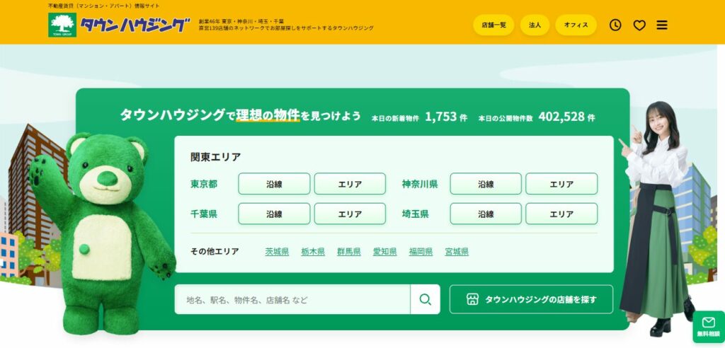 | タウンハウジング | ファミリー層に強い | 関東中心 | 約40万件以上 | 敷金礼金ゼロあり | 地域密着・沿線特化 | 家賃1か月分 |