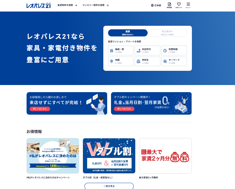 | レオパレス21 | 家具家電付き物件が豊富 | 全国対応 | 約54万件以上 | 敷金礼金ゼロあり | 短期契約・単身向け強み | 家賃1か月分 |